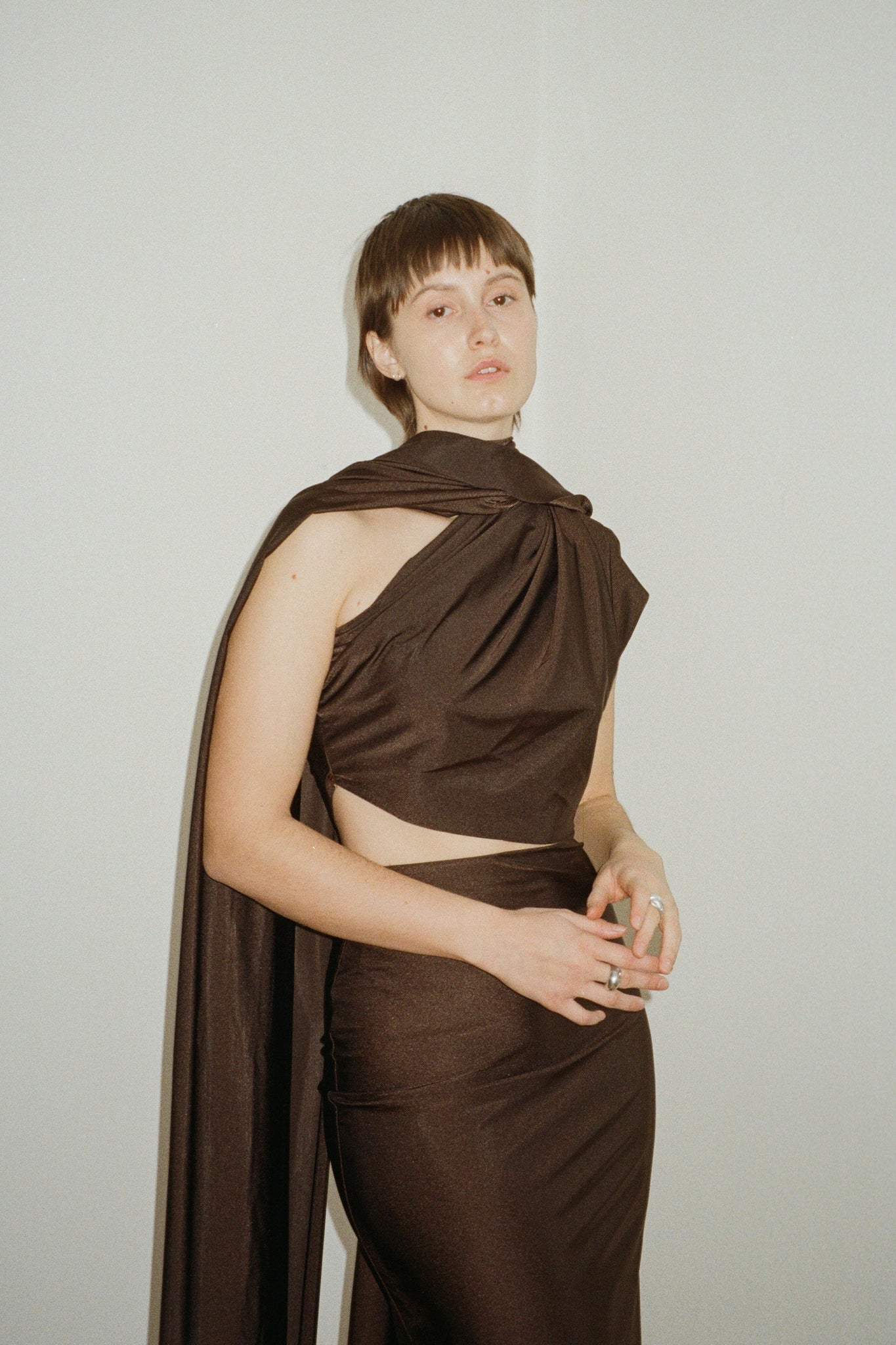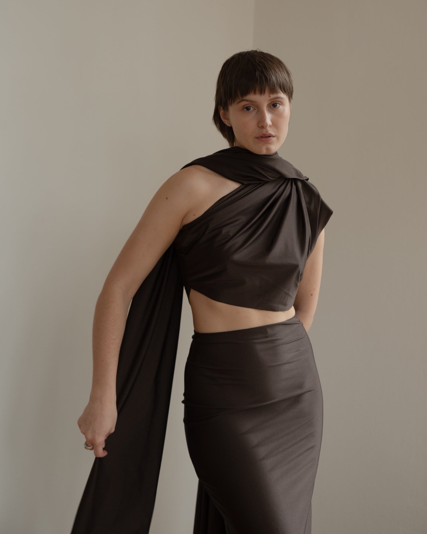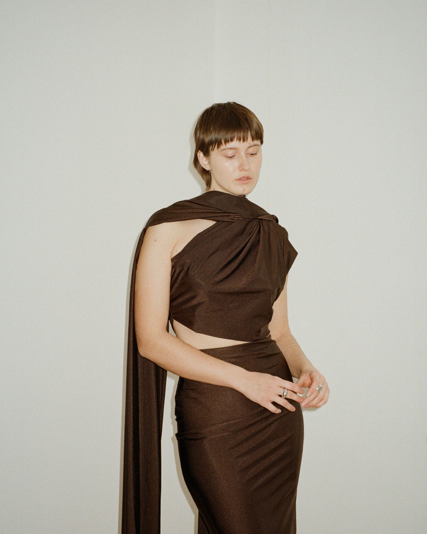 Elegant one-shoulder dress in a rich chocolate brown shade, made from stretchy Lycra for a comfortable, flattering fit. The length can be customized, as each dress is made to measure, ensuring a perfect fit just for you. Production takes 2–3 weeks, and the dress can also be created in other colors upon request.