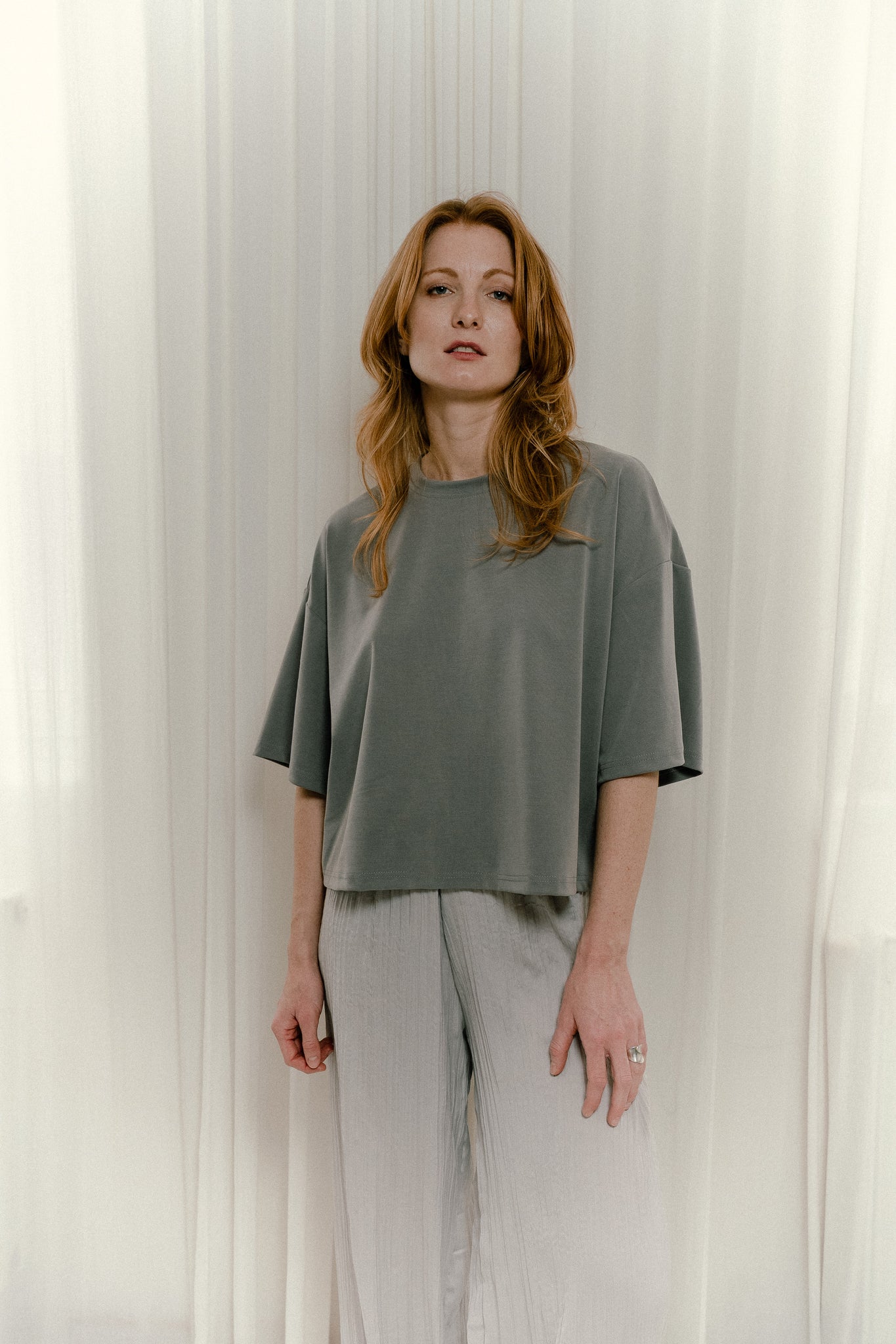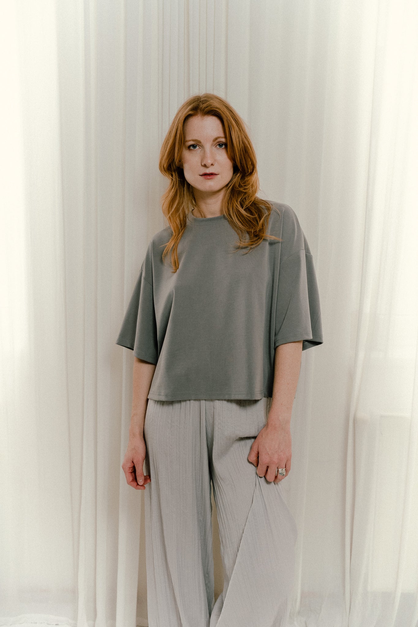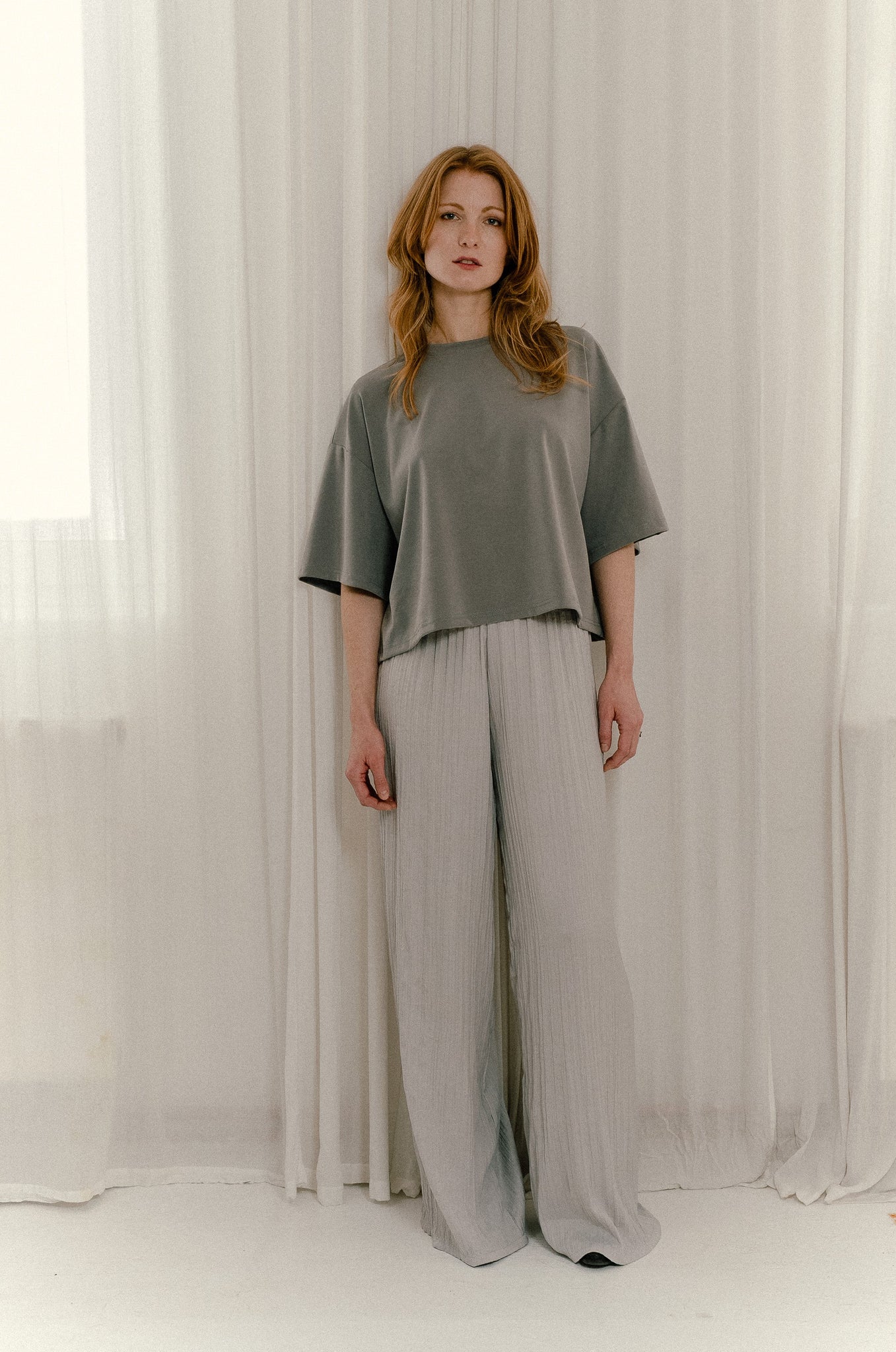 Comfortable, loose-fit pants made from 100% recycled material with a special crease finish that mimics pleating. The elastic waistband ensures everyday comfort and easy wear. Designed for durability and low maintenance, these pants are simple to care for and made to last.