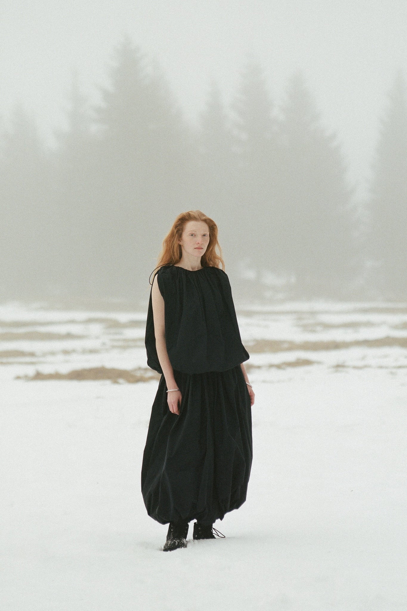 A versatile set featuring a lightweight taffeta skirt and matching top, designed for maximum adaptability. The drawstrings allow you to adjust the skirt length—wear it long and flowing or shorten it for a playful look. The top can also be transformed into a crop top, giving you multiple styling options from a single set. Elegant, lightweight, and endlessly customizable.